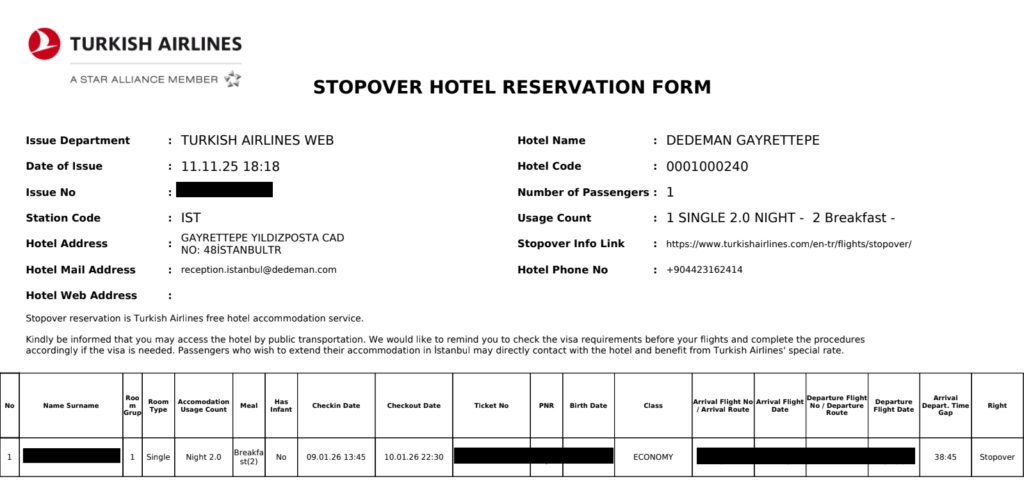 トルコ発着帰着から次の便まで20時間以上の乗継時間がある飛行機を購入したら、空港到着の72時間前までに事前予約が必要です。私は出発の1.5ヶ月前に予約しました。宿泊ホテルは一般客も使用する通常のホテルのため、空きの関係で早めに予約した方が好きなホテルを選べるかと思います。